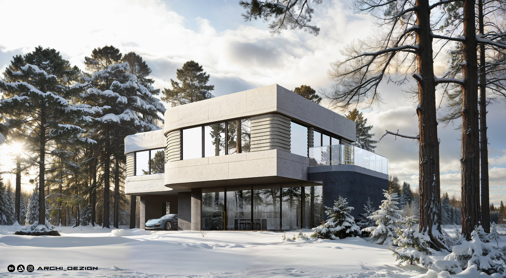 Зимний рендер был создан из летнего с применением ИИ, что позволило избежать отдельной зимней визуализации в Lumion и сэкономить клиенту время и средства